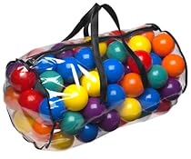 100 pcs Fun Ballz Intex 49600EP. My only real gripe about this product is that these balls are inconsistent in quality - some are made of thicker material than others. But that's not really a problem, for me anyway.These are, whichever way you look at them, thin plastic balls. They will crush, ding, dent or otherwise loose their perfect roundness if you let anything heavier than say, another plastic ball, collide with them. I mean, would you expect an egg to be able to cope with a three year old child jumping on it? No. It's an egg.However!If this distresses you greatly, you can resurrect them by warming them very gently with a hairdryer. Or as I did, leave them next to a heating vent.I placed an order for 1000 of these, they arrived in bags of 100, some rectangular bags, some cylindrical bags. The last 300 arrived loose in two boxes (150 balls a piece). ... It includes a carry bag 100 multi-colored Fun Ballz can be used to add