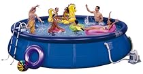 Intex Easy Set 18-Foot by 42-Inch Round Pool Set Intex 56416E. MAKE the ground flat...I dug out a space for it in my yard, built a little retaining wall around it with cheap paver bricks, filled the area with sand, leveled the sand, and voila. I leave the pool up in the winter with a cover over it, add the algae-cide and chlorine in the spring and its good as new. This is the best 60-70 dollars I've ever spent on my son. He, my nephews, and any other visitors play for hours and hours in the summer time...absolutely awesome for the money. I run the pump on a timer, 8 hours a day, add about 1 - 3 oz of chlorine granules a day in the hot summer, shock it after storms or heavy use, and it stays clear and clean. The directions clearly state that you must set up on level ground. ... Our Complete 18 Foot Diameter Easy Set Pool Sets Include: * 1,500 Gal/Hour Filter Pump * Ground Cloth * * Ladder * * Pool Cover * * Deluxe Pool Maintenance Kit * *